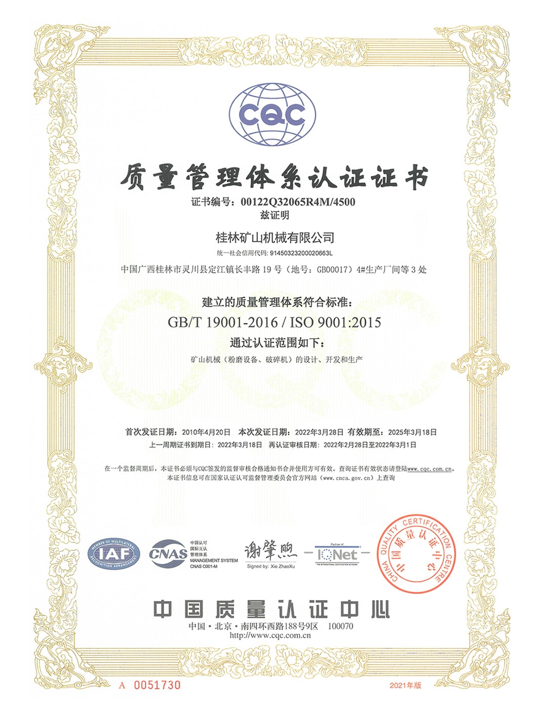 為使每一臺出廠的產(chǎn)品品質(zhì)得到保證,桂林礦機(jī)建有多條現(xiàn)代化先進(jìn)設(shè)備生產(chǎn)線,以嚴(yán)謹(jǐn)?shù)墓芾砹鞒瘫U厦康拦ば蚨挤瞎に嚵鞒毯虸SO9001:2015質(zhì)量管理體系標(biāo)準(zhǔn),力求每一處細(xì)節(jié)都經(jīng)得起考驗,保證產(chǎn)品在各個制造階段的整體品質(zhì)。
